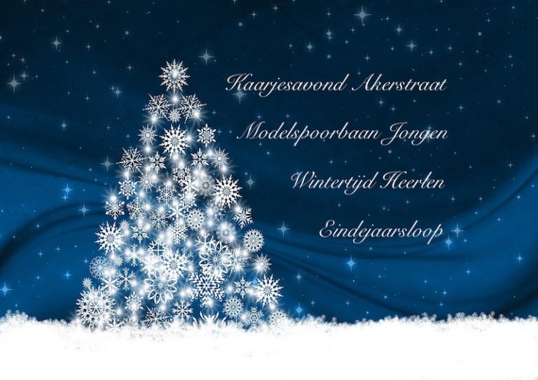 Pak je agenda en schrijf mee: 23 december (van 17 tot 20 uur) Kaarsjesavond begraafplaats Akerstraat, zaterdag 29, zondag 30 december en zondag 6 januari (allen van 11 tot 17 uur) opendagen Limburgs grootste Modelspoorbaan en op Oudejaarsdag: de Eindejaarsloop.