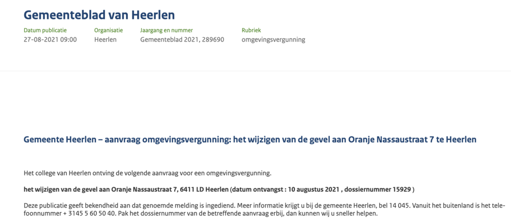 Onlangs, op 27 Augustus jl., publiceerde de gemeente Heerlen een aanvraag omgevingsvergunning: ‘Het wijzigen van de gevel aan Oranje Nassaustraat 7 te Heerlen’. Een aanvraag die de stad op 10 Augustus jl. ontving. ‘Apart’ omdat die gevel al lang en breed aangepakt (en vervangen) werd door Atelier Stadsrevisie. Een ‘grootschalig kunstproject’ dat met flinke subsidie …