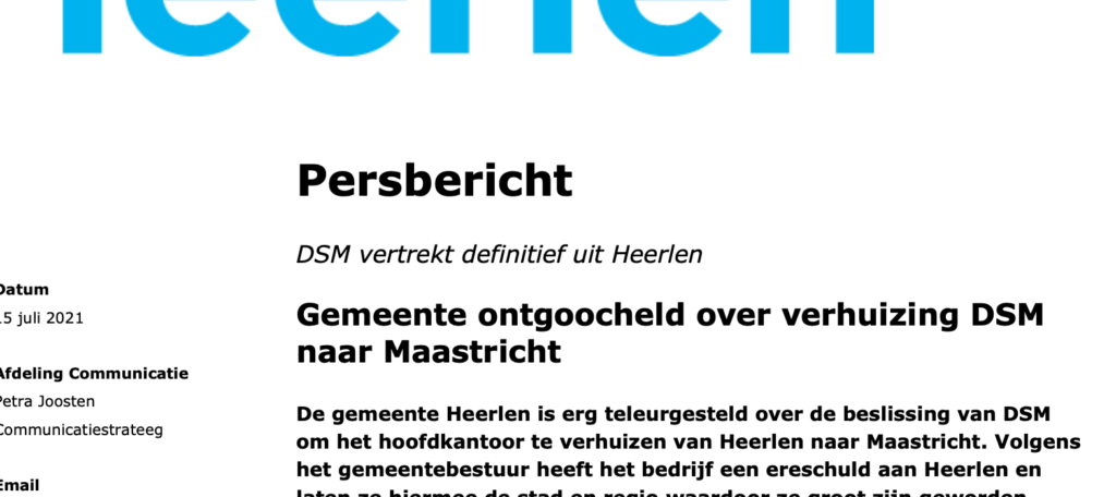 Met de enorme waterellende amper achter de rug kondigt zich plots een volgende dreun aan. Per raadsinformatiebrief laten burgemeester en wethouders de gemeenteraad zojuist het volgende weten: DSM persbericht inzake verhuizing naar Maastricht (link naar: DSM persbericht ) Daar waar uit bijgaande stukken blijkt dat het stadsbestuur kennelijk reeds sinds april inhoudelijk op de hoogte was wist de gemeenteraad …