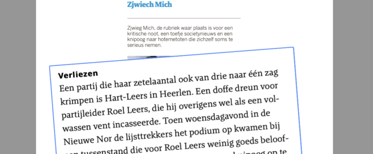 Vandaag in de krant – Zjwiech Mich Geplaatst op 19/03/2022Geüpdatet op 19/03/2022door Roel LeersCategorieën:Gemeenteraadsverkiezingen, heerlen, Nieuws, Vanuit de fractie